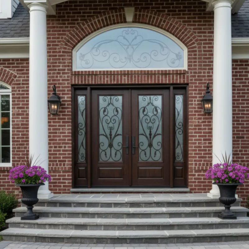 Handcrafted Wrought Iron: Features intricate, ornate scrollwork that adds a layer of physical security and high-end curb appeal to your front door system.